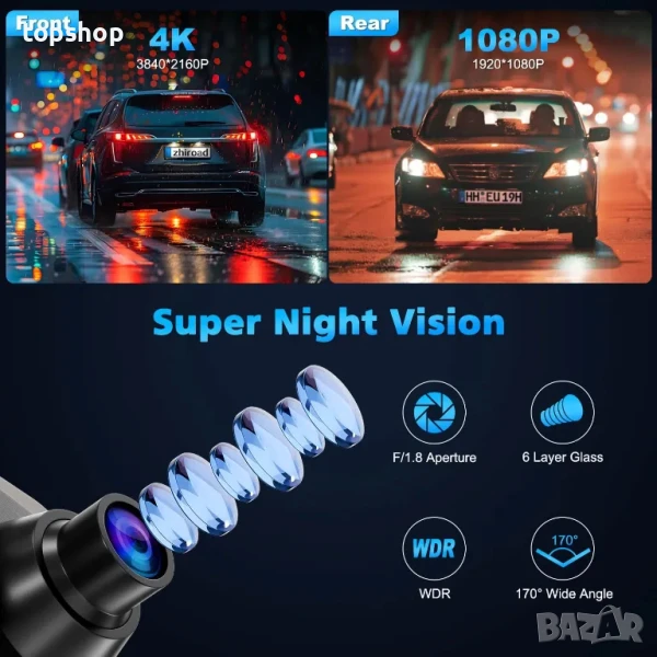 видеорегистратора са оборудвани с 6-слойни лещи. Апертурата 1.8 и WDR технологията ефективно балансират яркостта в много светла и тъмна среда и я регулират автоматично, правейки видеоклиповете, записани през нощта, по-ясни и подобрявайки безопасността при нощно шофиране.