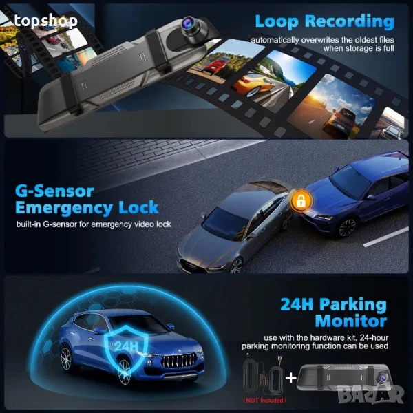 НОВА, ПЕРФЕКТНА, ПЪЛЕН КОМПЛЕКТ WeBeqer Dashcam, даш камера в автомобилно огледало с 10" сензорен екран, 64GB карта, 4K+1080P, 170°, нощно виждане, GPS, помощ при движение на заден ход, G-сензор, монитор за паркиране