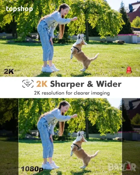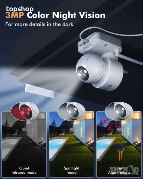 Захранвана със слънчева енергия камера за сигурност на открито може да завърти главата си на 336° хоризонтално и 108° вертикално, за да осигури ултраширок зрителен ъгъл, значително намалявайки слепите петна. Контрол на посоката в приложението, имате бърз преглед на всичко около вас. PTZ камерите за сигурност използват усъвършенстван чип, за да осигурят зашеметяващо 2K/3MP изображение с ясни детайли. Прожекторът се включва автоматично, когато човек бъде открит в непрогледна тъмнина и може да види обекти на разстояние до 20метра през нощта.