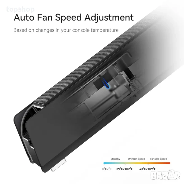 Охлаждащият вентилатор е оборудван с два режима на работа: Low със скорост 3500 +/- 10% RPM и Auto, който се адаптира към текущите нужди на конзолата, достигайки скорост до 5000 +/- 10% RPM. Тези опции ви позволяват да оптимизирате работата на вентилатора в зависимост от интензивността на използване на конзолата, което се изразява в по-дълъг живот и по-добра производителност.