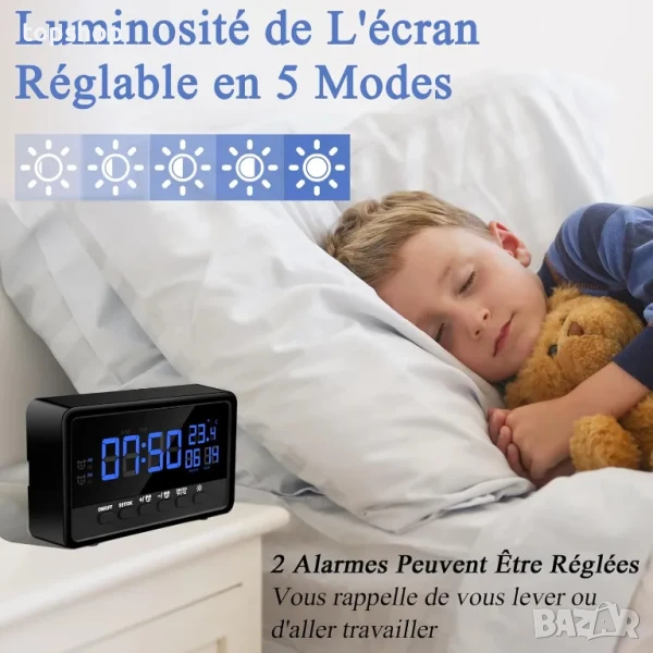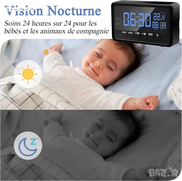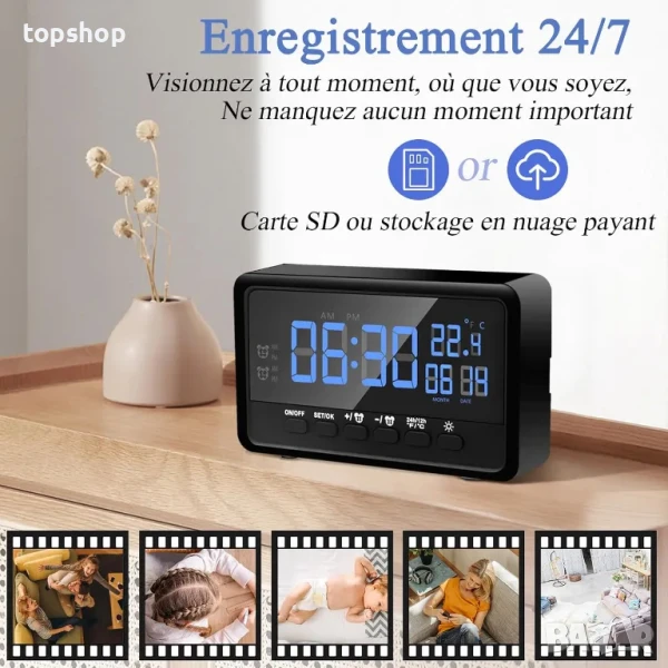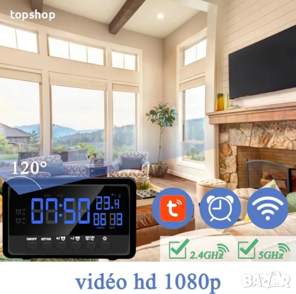 Многофункционален будилник с wifi камера. Екранът на часовника показва голям брой информация с текущия час, температура (°F/C), месеци и дата, можете да зададете правилната информация ръчно чрез бутона на камерата. Можете също така да зададете 2 аларми, които ви напомнят да станете, за да не закъснеете за работа/училище
