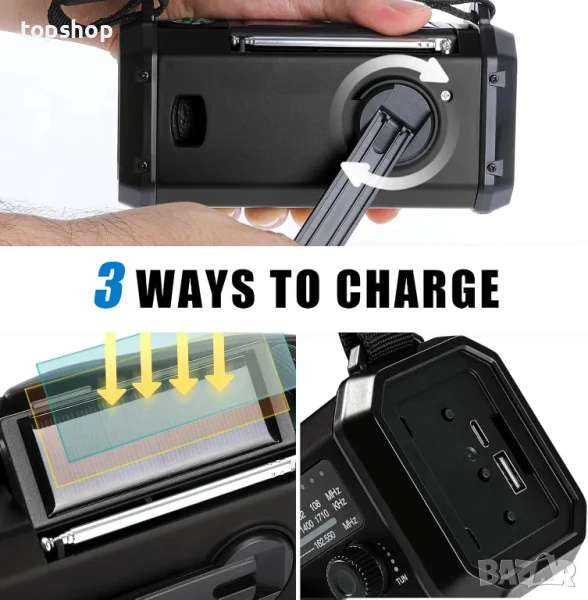 Радио за спешни случаи – Радиото за времето за спешни случаи може да получава NOAA /AM/FM сигнал. Когато сте в спешен случай, включете го, за да предостави важна информация за времето за вашите нужди. Можете да получите най-новите новини за времето за спешни случаи и информация за времето навън. Радиото за времето е вашият първи избор. Нека повече не губите външна информация при опасно време. Защитете вас и вашето семейство в опасно време. Страхотно ????????? ??? за торнадо, цунами, горски пожар, ураган и снежна буря.