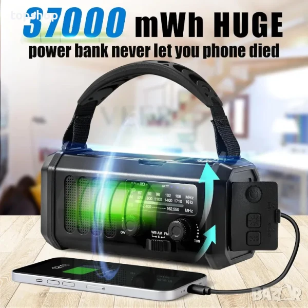 Огромна захранваща батерия - Работещото с батерии радио има 10000 mAh захранваща банка, която е супер огромна спешна захранваща банка. Тя никога няма да позволи на телефона ви да се изключи. Полимерна батерия от 10 000 mAh може да осигури достатъчно аварийно захранване за важна помощ при спешни случаи.