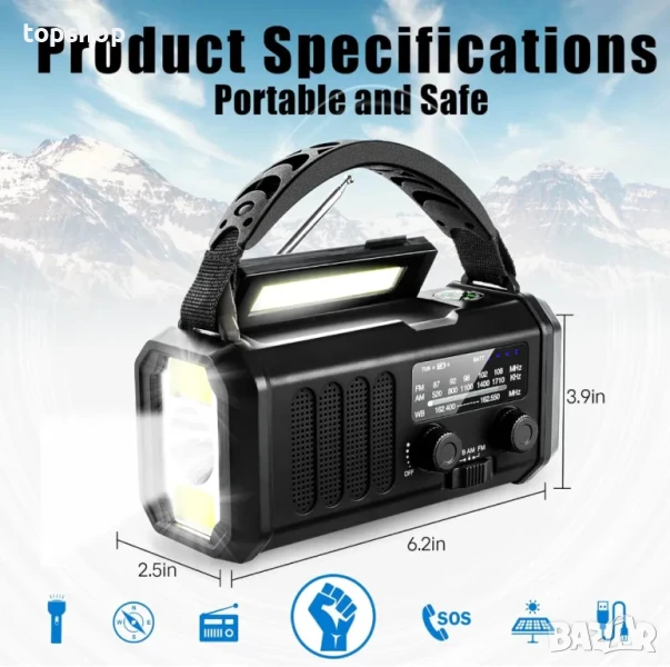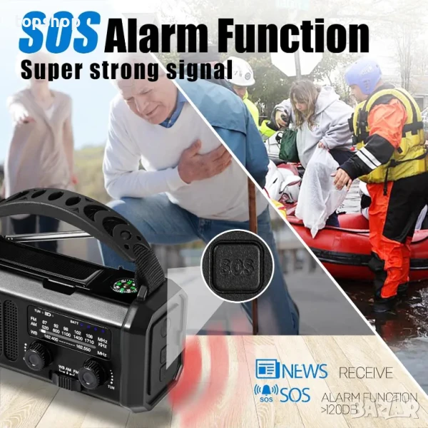 Преносимо радио и SOS аларма - Метеорологичното радио NOAA има найлонова каишка за носене. Презареждаемото метеорологично радио е практично и преносимо и се предлага с функция SOS аларма. Радиото има и компас, който е отгоре на радиото. Много е полезно да идентифицирате посоката, когато сте на туризъм, къмпинг или други спортове на открито. За целите на туризъм или трекинг този тип радио е умен избор.