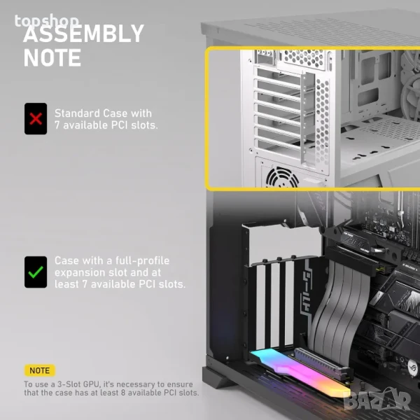 Оптимизиран за корпуси с пълен PCI слот: Пригоден за корпуси със 7 отворени PCIe слота, този вертикален монтаж за графичен процесор е идеален за серия RTX40; 3-слотови графични карти, изискващи корпус с минимум 8 слота за оптимално прилягане и стабилност.