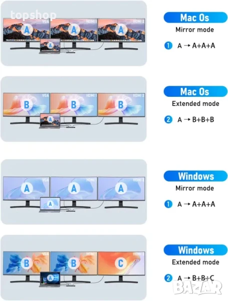 ✔【Докинг станция с двоен монитор 2 HDMI и VGA】Тази usb c докинг станция ще ви помогне лесно да постигнете дисплей с двоен и три монитора, отговаря на всички ваши нужди и улеснява работата ви; HDMI 1 за еднократна употреба може да до 4K 30Hz при източник DP1.4; И поддръжка на разделителна способност до 4K@30Hz & 2K@60Hz при едновременно свързване на двоен HDMI; И поддръжка на разделителна способност до 1080P за външни 3 монитора при трикратно показване под източник DP1.4;★Забележки: Лаптопът MacOs поддържа само SST режим, така че всички екрани на външни монитори ще бъдат еднакви.