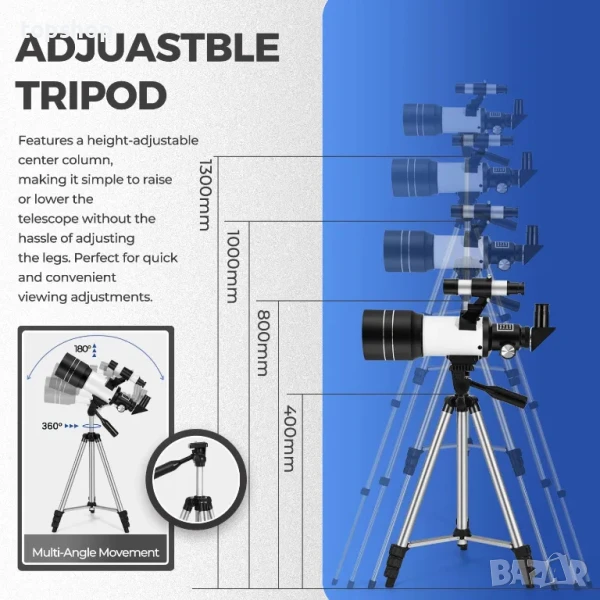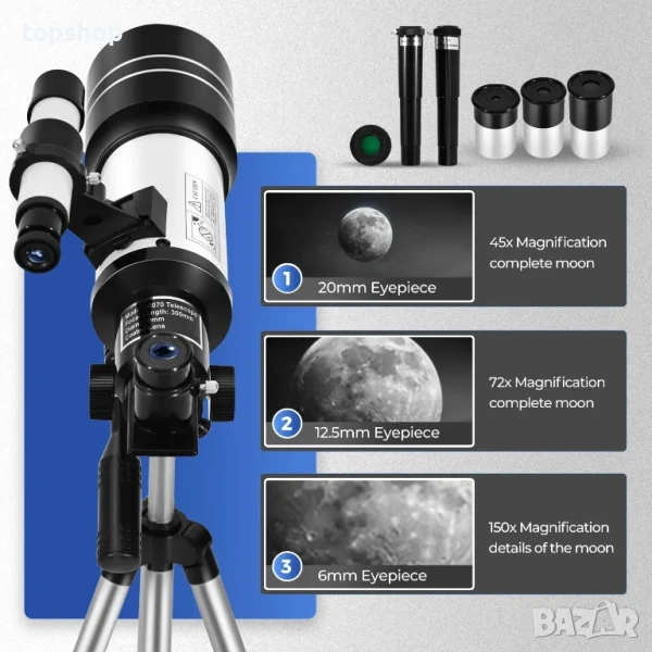【Телескоп с висока мощност】 Предлага се с 3 окуляра за постигане на различни увеличения и леща на Барлоу, която може да утрои увеличението до 150x. Диагоналът на звездата е включен, за да даде изображение с дясната страна нагоре. Този телескоп е подходящ за наблюдение както на небесни, така и на земни обекти.