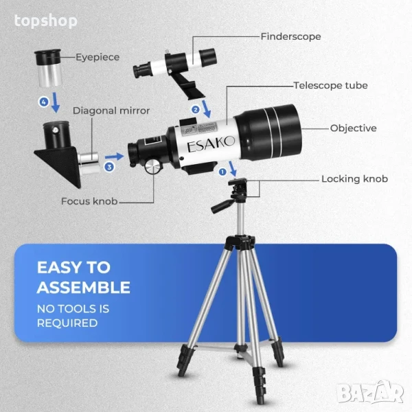 телескоп ESAKO - апертура 70 mm, 3 окуляра, статив с регулируема височина, адаптер за телефон