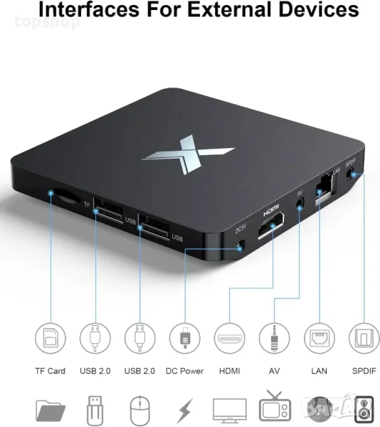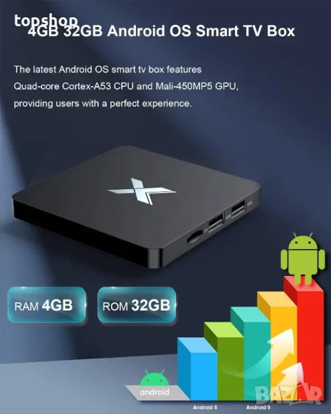 TV Box Quad-Core CPU 4GB RAM 32GB ROM, Android TV Box с 2.4Ghz/5.0Ghz WiFi 10/100M Ethernet, Smart TV Box Поддържа Bluetooth 5.0 H.265 3D HDMI 2.0