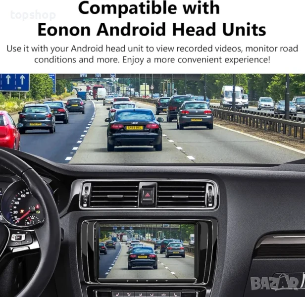 Съвместим с главни устройства Eonon Android: Съвместим с всички основни устройства Eonon Android 10 Android 11 Android 12, които се продават. Използвайте тази камера за табло с вашето главно устройство с Android, за да гледате записани видеоклипове, да наблюдавате пътните условия и много повече - всичко това на големия екран на устройството.