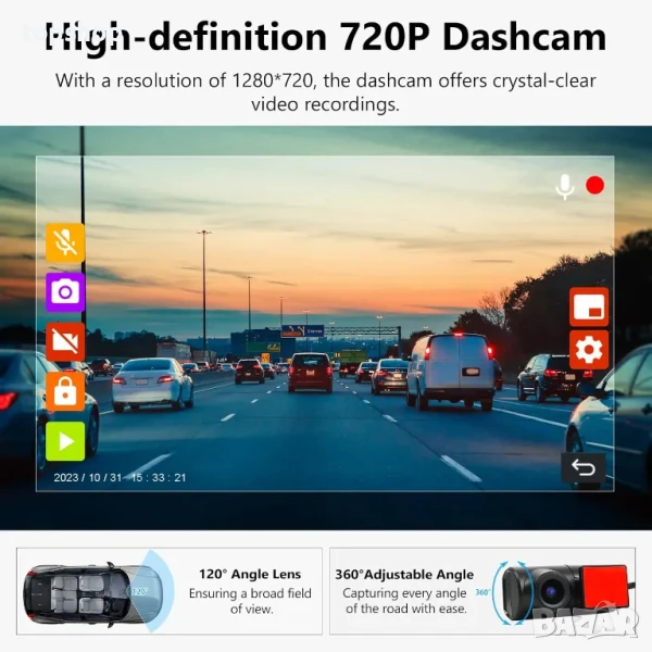 HD 720P Dashcam с 360° регулируем ъгъл: С разделителна способност 1280*720, записващото устройство предлага кристално ясни видеозаписи. 360° регулируем ъгъл помага за улавяне на всеки ъгъл на пътя с лекота.