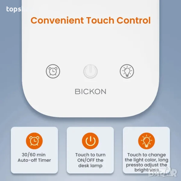 Елегантна и минималистична лампа, добавяща докосване на изтънченост към декора на вашия дом или офис. Регулируеми цветове и яркост, гъвкаво осветително рамо и глава правят настолната лампа BICKON перфектна за учене, работа, игри, шиене, ноктопластика, рисуване, четене, гримиране, редене на пъзели, правене на снимки, пътуване и т.н.