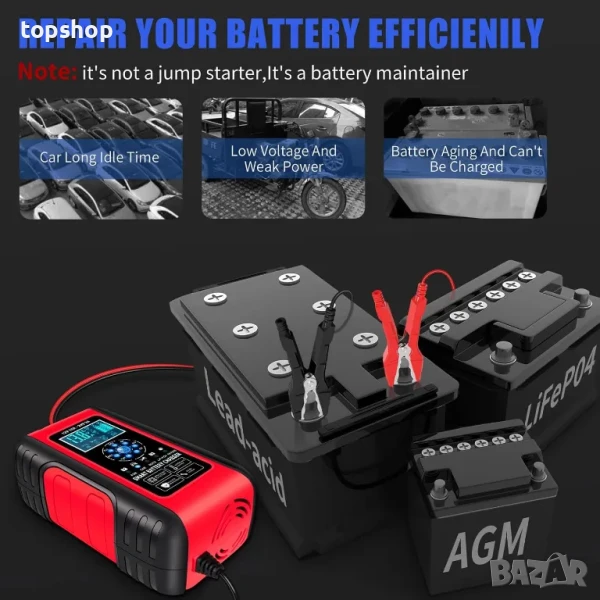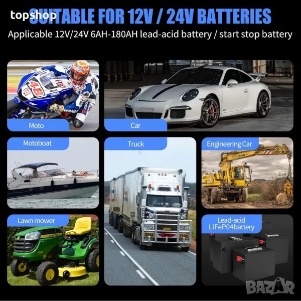 【2 в 1 оловно-кисели LiFeP04 зарядни устройства, устройства за поддръжка и десулфуриране】10A автоматични зарядни устройства за батерии са 5,3 инча "Д x 9 инча" Ш x 3 инча "В, използват обхват на батерията: 6-180 Ah. Идеални за бързо зареждане и обслужване на всички видове 12V и 24V оловно-киселинни автомобили, RV, Powersports и батерии с дълбок цикъл, включително наводнени, гел, AGM, SLA, GEL, бордови зарядни устройства за батерии за лодки, камиони, SUV, селскостопански превозни средства, триколки, колички за голф, мотоциклети, косачки, превозни средства за всички терени, LiFeP04 батерии и др.
