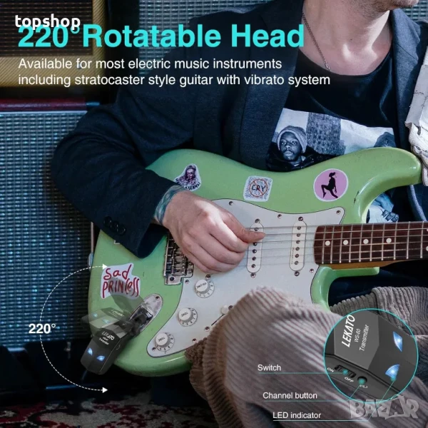 Дългите работни часове могат да осигурят добра производителност за всяко шоу Plug and Play: Натиснете продължително бутона за сигнал, за да синхронизирате предавателя и приемника едновременно, не са необходими допълнителни действия Едно към едно и безпроблемно,Plug and play, стартирайте свиренето ви за секунди Въртяща се безжична китарна система: Въртящата се на 220° глава ви позволява да регулирате позициите на различни инструменти с помощта на входния жак