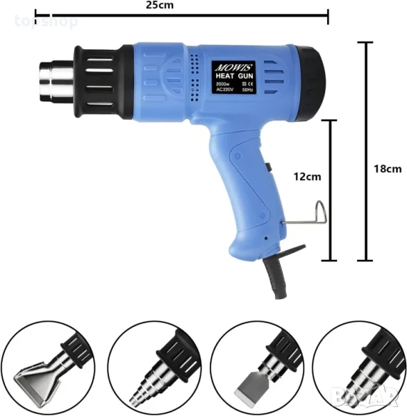 Съдържание на кутията: 1 x вентилатор за горещ въздух Mowis 2000 W, 4 x дюзи за горещ въздух, 1 x ръководство за потребителя. Ние предлагаме 24 месеца гаранция и професионално обслужване на клиенти и техническа поддръжка за нашия топлинен пистолет. Моля, не се колебайте да се свържете с нашето обслужване на клиенти, ако имате проблеми.