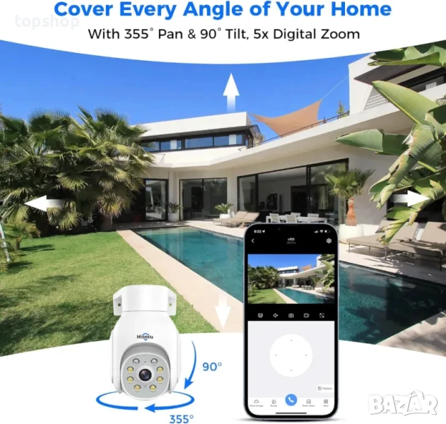 【Откриване на движение и звукова светлинна аларма】Външната ptz камера WiFi притежава функцията за откриване на движение. Той ще ви изпрати известие чрез приложението, когато движението бъде уловено, също с кратко видео, което да изпратите до приложението на телефона си. И когато хората навлизат в зоната на монитора, външната PTZ камера ще включи бяла светлина и ще издаде звук на сирена, за да изплаши непознатите
