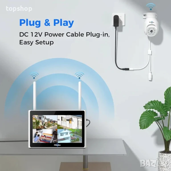 Нова, тествана система за видеонаблюдение [ PTZ+10" монитор ] Hiseeu 4бр. 5MP PTZ камери, 10'' монитор, 10CH NVR с 1TB HDD, 4PCS 360° PTZ външни камери, цветно нощно виждане, 2-посочно аудио, APP и PC дистанционен преглед