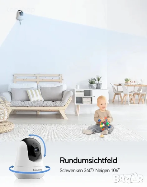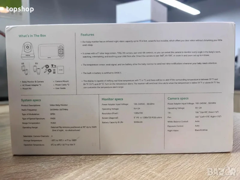 5-инчов голям дисплей, 720P пиксела с висока разделителна способност, можете ясно да обърнете голямо внимание на малкото момче при дневна светлина и тъмни условия, 4 пъти увеличение на изображението, можете лесно да разберете дали бебето е заспал или буден, 360° панорамен изглед, можете да го използвате в креватчета, кошари, детски стаи и др.