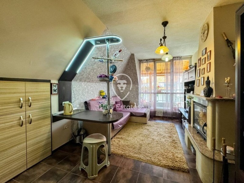 Удобно разпределение с отделно входно антре, голяма остъклена лоджия. Просторна дневна с оборудвана кухня, бар за закуска, кът за сядане и камина. Благоприятна спалня. Всяка стая разполага с климатик. Баня с душ.