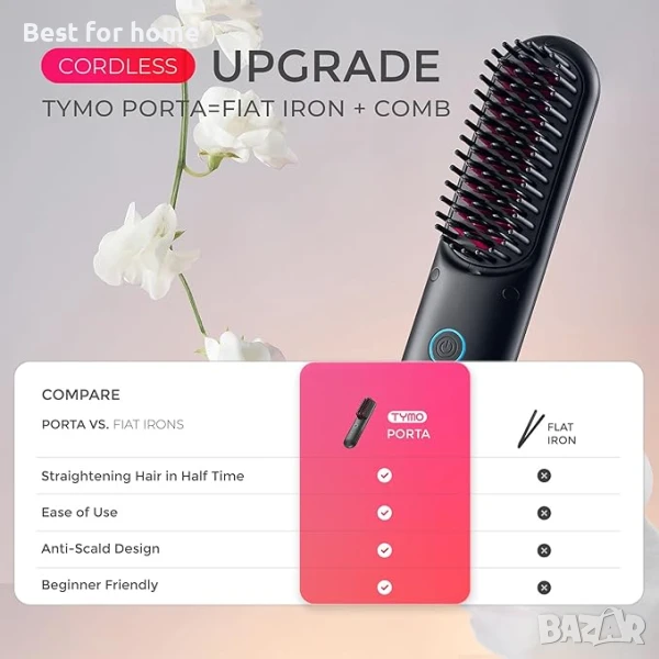 Безжична четка за изправяне на коса TYMO - Porta ECO преносима четка за изправяне за пътуване, мини гребен за горещо изправяне за жени, керамично покритие, лека за освежаване, устойчива на изгаряне, черна