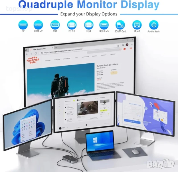 【USB C докинг станция 16 в 1】: Тази докинг станция за два монитора е оборудвана с USB C PD порт (само за зареждане), Gigabit RJ45 порт, 2* 4K HDMI порта, VGA и DisplayPort, слот за SD/TF карта, 2* USB 3.1 порта (до 10Gbps), 2* USB 3.0 порта, 2* USB 2.0 порта и 3.5 мм аудио и микрофон портове. С plug and play връзка, тази USB-C докинг станция може да направи работата ви по-ефективна.