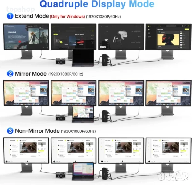 【Функция за множество дисплеи】: Тази USB-C докинг станция с 2 HDMI порта позволява на вашите USB-C лаптопи да разширят 2 различни монитора. Нашият USB-C адаптер за два дисплея поддържа единични и двойни HDMI дисплеи до 3840x2160@30Hz или тройни дисплеи до 1920x1080@60Hz. Предлагат се четири режима на показване (режим на огледало, режим на разширяване и режим на колаж). ?ЗАБЕЛЕЖКА: Лаптопите с macOS поддържат само SST режим, така че екраните на всички външни монитори ще бъдат еднакви.