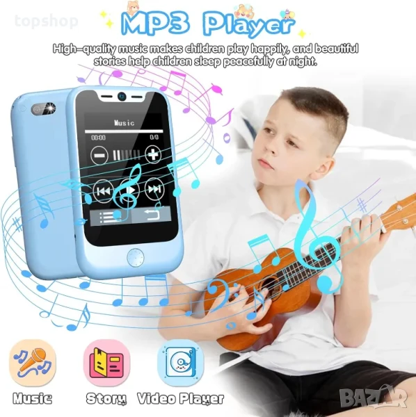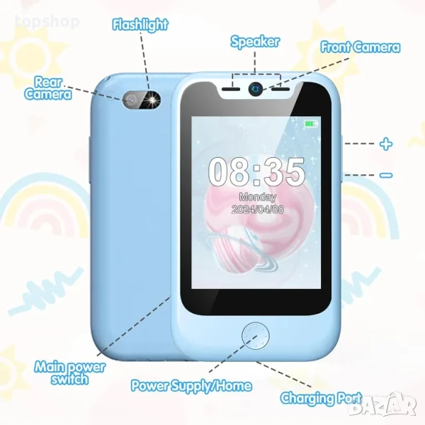 【Многофункционален детски телефон】 Характеристики: Възпроизвеждане на музика, четене на истории, предна и задна камери, аудиозапис, крачкомер, хронометър, учебни карти, часовник с и 16 пъзел игри. Допълнителни функции: HD сензорен екран с гладко усещане при докосване, преносим порт за окачване за лесно пренасяне, голямо хранилище за до 1000 снимки и USB Type-C кабел за зареждане.