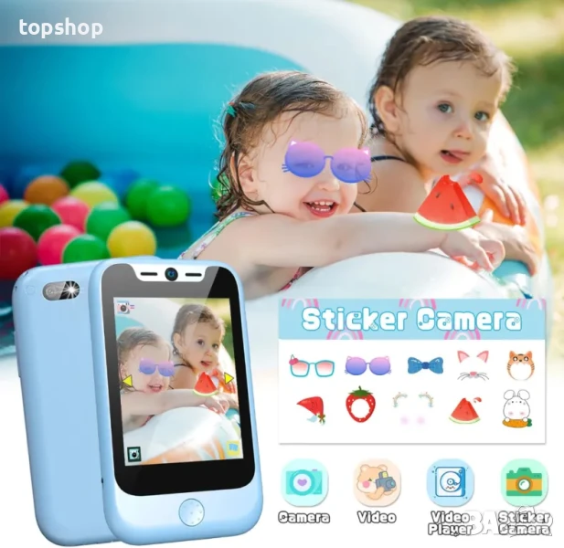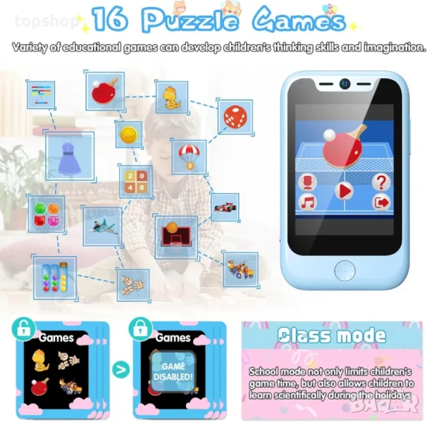 Телефон за деца със сим карта и различни игри, родителски контрол, музика, камера, тъч скрийн - син