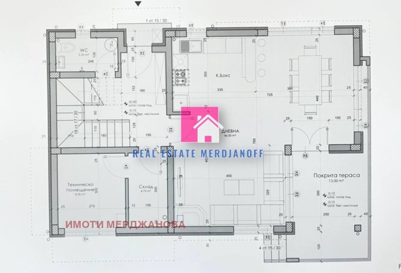На първият етаж на къщата е разположена слънчева просторна всекидневна от 46 кв.м с кухненски бокс и трапезария, покрита тераса 13 кв.м, техническо помещение 8 кв.м, склад 4.75 кв.м, тоалетна 3,35 кв.м, коридор със стълбище. Първият етаж е с РЗП 110 кв.м.