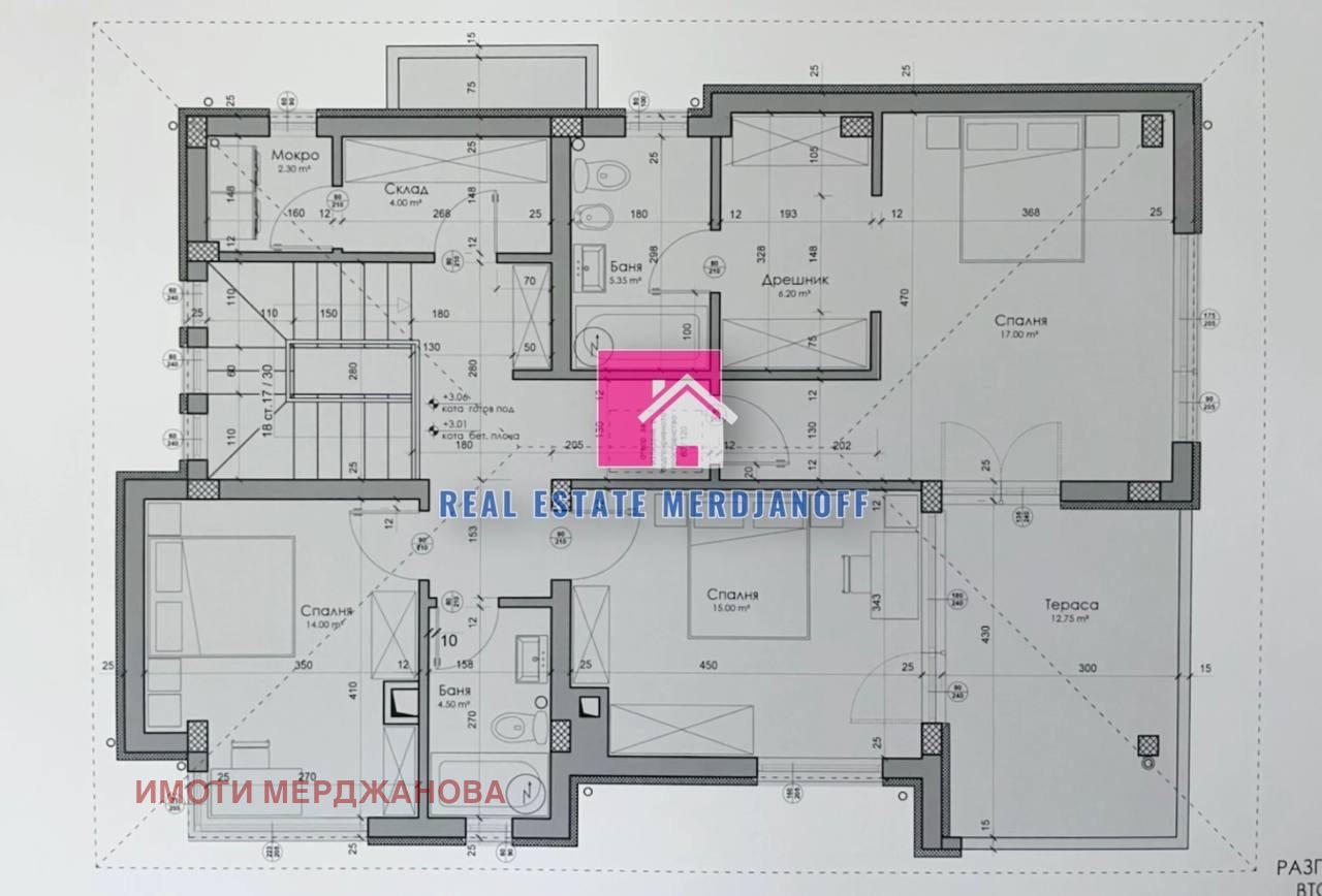 На втория се намира три спални - родителска спалня с дрешник от 17 кв.м, с баня и тоалетна 5.35 кв.м, втора спалня от 15 кв.м и трета спалня 14 кв.м, втора баня на етажа 4.50 кв.м, складово от 4.00 кв.м и мокро 2.30 кв. м помещения, тераса от 12.75 кв.м с достъп от родителска и втора спалня. Вторият етаж е с РЗП 120 кв.м. Акт 16 в началото на 2024 г.