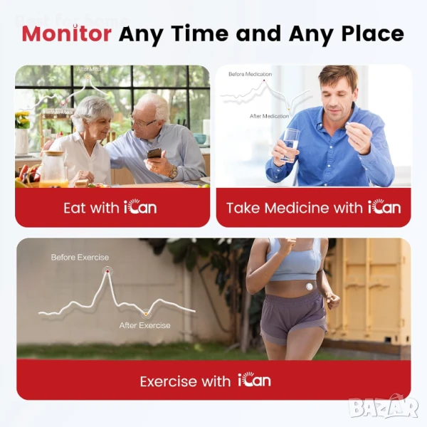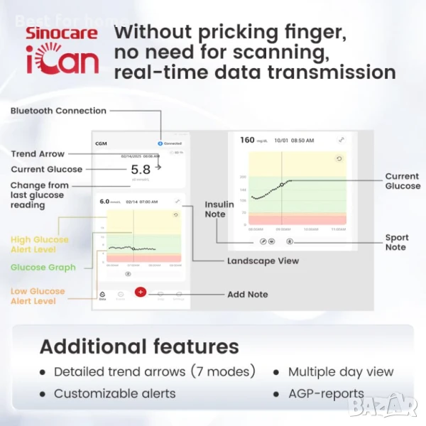 【По-малко убождане на пръсти и без сканиране】Няма нужда да убождате пръстите си често, за да получите стойностите на кръвната си захар. Меката и гъвкава игла може да ви осигури комфортно изживяване. Sinocare iCan CGM използва Bluetooth предаване и чрез приложението iCan CGM няма нужда да сканирате сензора, за да получите резултатите – удобно решение за всеки тип потребител.