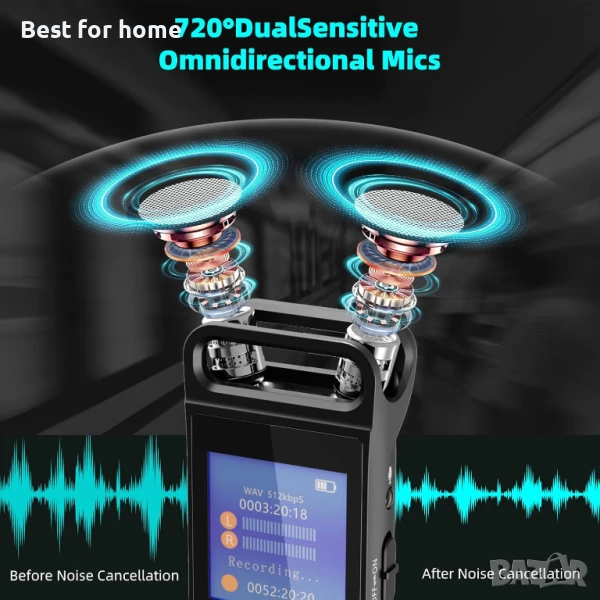 【3072 kbps Високопроизводителен микрофон и DSP шумопотискане】Рекордерът използва 2 високопроизводителни всепосочни микрофона, 720° съраунд звук и запис на живо от 60 фута (18 метра). Оборудван е с мощен ANC чип и технология за цифрова обработка на сигнала (DSP), която позволява интелигентно шумопотискане, така че можете ясно да записвате/възпроизвеждате висококачествени записи. Максималната поддържана битрейт е 3072 kbps.