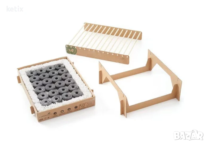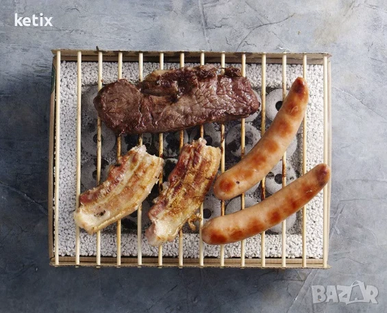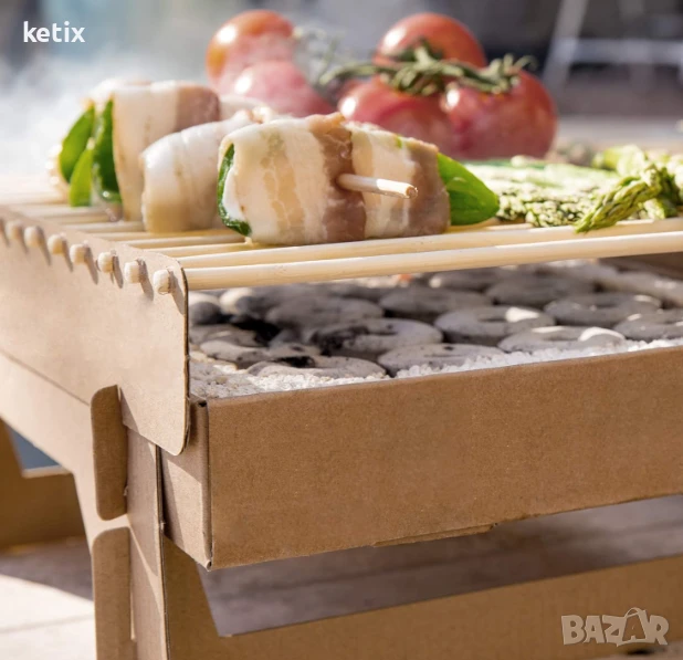 Екологичната скара за еднократна употреба от Meateor е изработена от 100% естествени материали: решетката на скарата е от бамбук, дървените въглища са от бамбукови брикети, рамката е от картон с инкрустация от вулканичен камък.