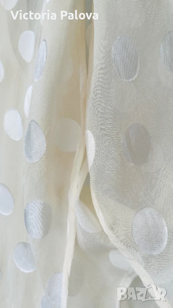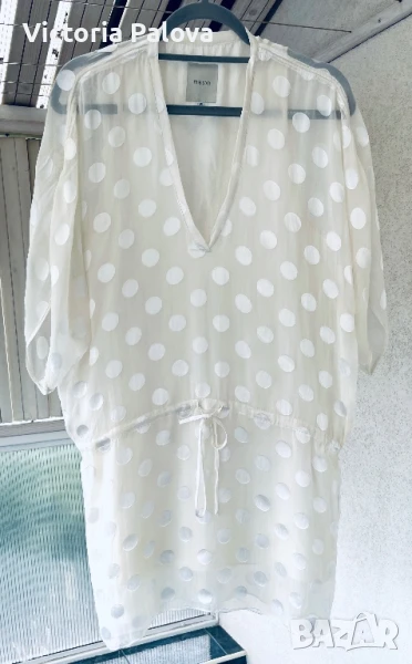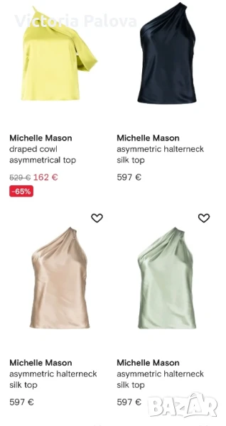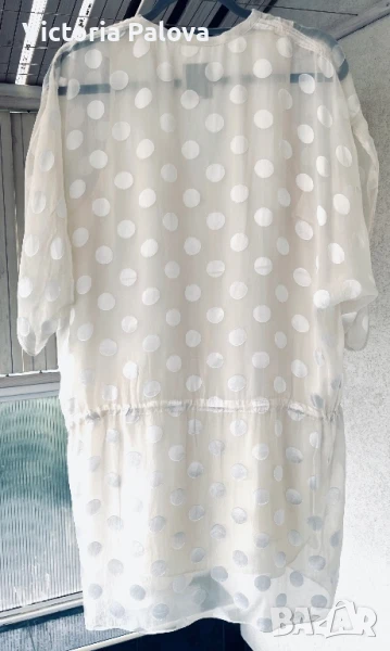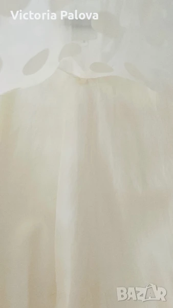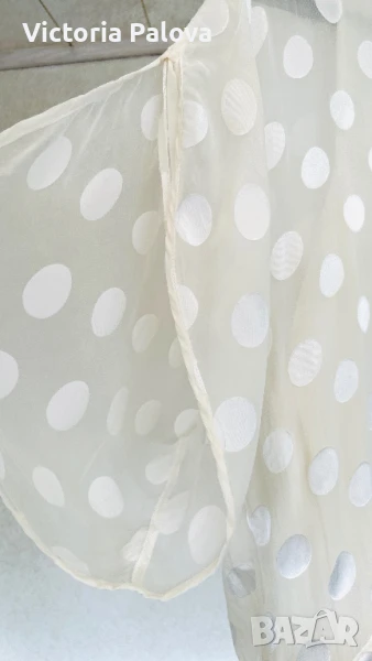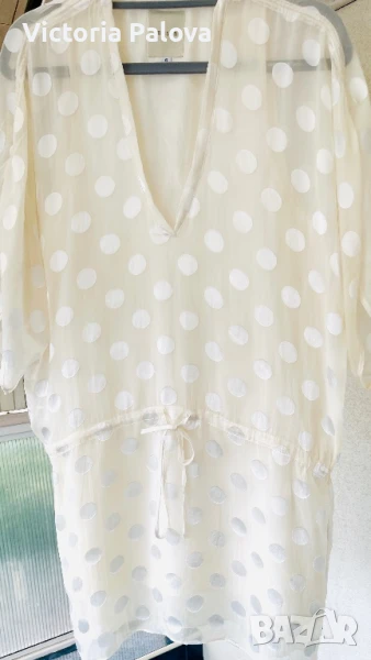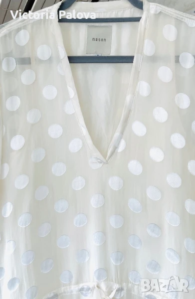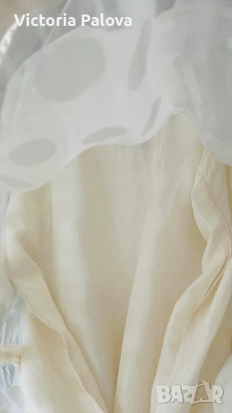 Michele Mason - американска марка класа лукс - изключителна женственост, чиста палитра на цветове, красиви форми и силуети, премиално качество на материи. Блуза или туника млечен нежен цвят, 100% летяща коприна : и вътрешния потник( подплата), и материята на блузата. ГО на подплатата - 52см, дължината на блузата отпред - 86см, отзад - 94см.