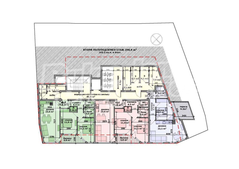 общи части /стълбище и коридори / завършени на 100 % - положен гранитогрес на пода и стълбището, стените измазани с положена боя /минерална мазилка/.