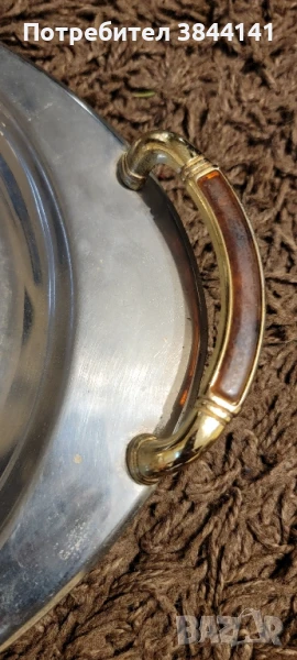 Продавам поднос от стомана с апликации и дръжки с позлата и кехлибар.