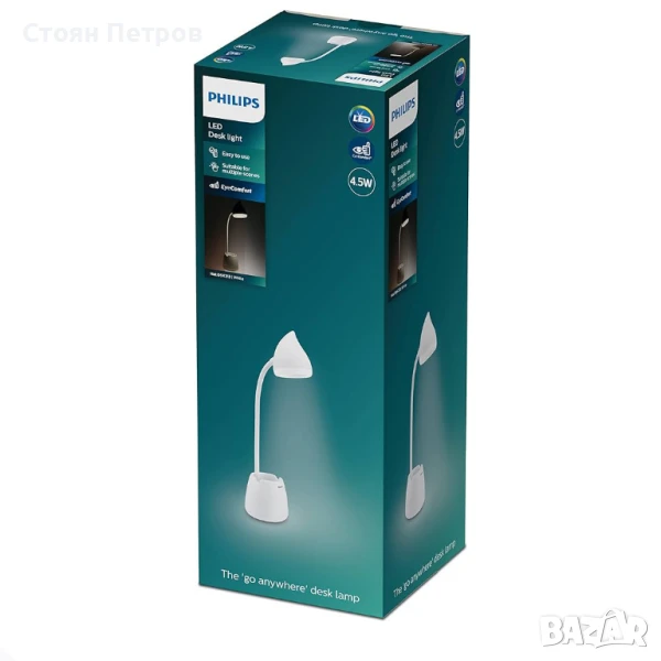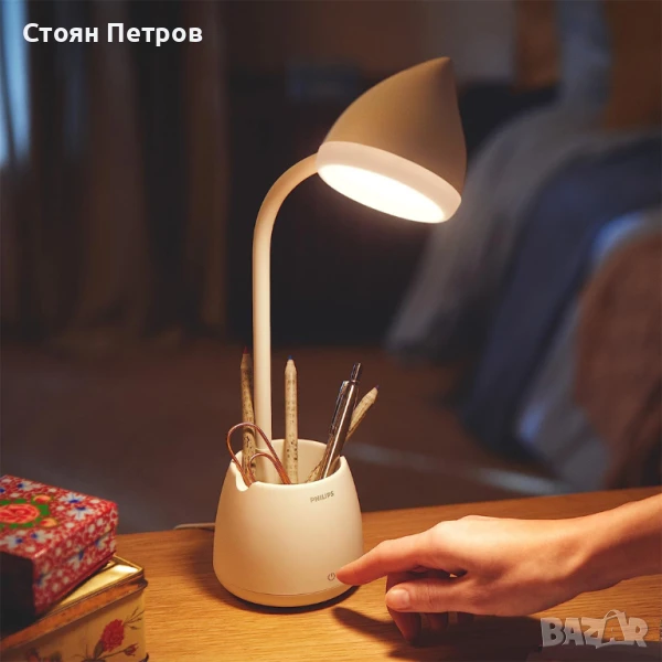 Предлагаме настолна LED лампа Philips Hat DSK213. Захранвана с акумулаторна батерия, с регулируема яркост и цветна температура (3000–5700 K). Не зависи от контакт. След като я заредите, може да си я местите където пожелаете. Подходяща за спалня, хол, домашен офис, ученическо бюро с комфортна светлина за очите (Eye Comfort