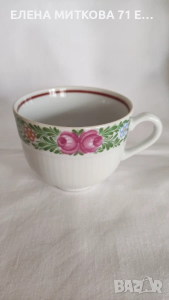 Един прекрасен сервиз за чай на "Kahla" ГДР-блестящ бял порцелан с релеф ,свежа флорална декорация и червеникавокафяв кант.Състои се от:
