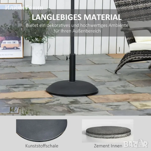 Високо качество: Стойката за чадър тежи впечатляващите 25 кг и осигурява сигурна стойка за вашия чадър.