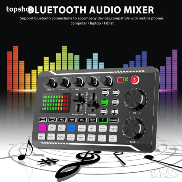 【Професионална звукова карта F988】Насладете се на звук с най-високо качество с нашата най-нова звукова карта F988 Live! Проектиран с внесен двоен DSP чип, Bluetooth безжичен акомпанимент, прецизна настройка с двойно тласкащо устройство и усъвършенствана интелигентна система за управление на светлината, която ще освети вашия концерт в ритъма на музиката, правейки го още по-вълнуващ. Светлините на конзолата могат да се управляват от логото Lightning на конзолата.