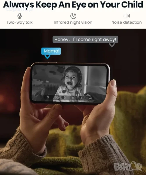 【Откриване на шум и двупосочен глас】 Активирането на откриване на шум на домашни камери на закрито позволява на новите родители да получават известия в реално време чрез приложението, когато бебето им плаче или издава шум през нощта. Двупосочната аудио функция позволява на родителите да общуват и да успокояват бебето си, създавайки по-спокойно и приятно нощно изживяване за цялото семейство.