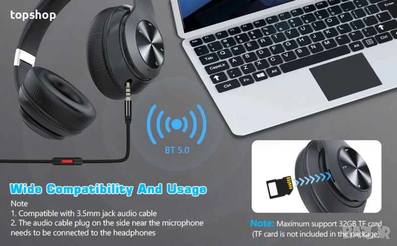 Нови безжични слушалки с микрофон 9S + TF карта, PC, Gaming, Bluetooth, Super Bass, Черни