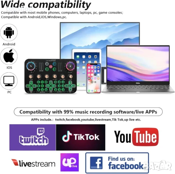 Широко използвано Звуковото устройство може да се използва на повечето мобилни телефони, компютри, таблети, PS4, Xbox, Switch, iOS, Android и платформи за игри. Професионален студиен запис, караоке, гласов чат, стрийминг на живо, Facebook, Youtube, Tiktok, WeChat и др.