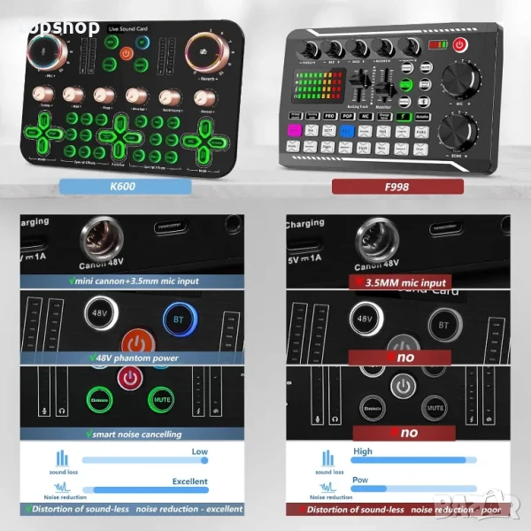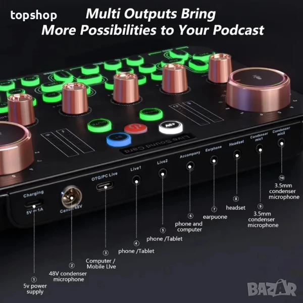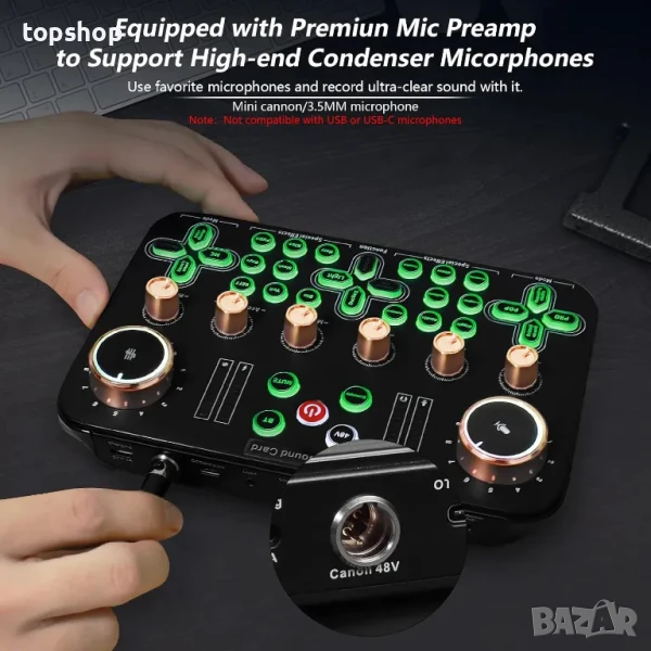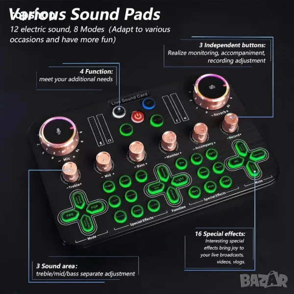 Аудио миксер на живо с професионално качество: микрофон, реверберация, независими настройки за високи, средни, баси и професионални настройки на монитора. 8 сценични режима и 16 вградени специални аудио ефекта за вашите творения. Вградена 1800mAh акумулаторна батерия с голям капацитет за 8-12 часа непрекъсната употреба. Съвместим с двоен телефон на живо, двоен микрофон и хибриден лаптоп на живо, напълно съвместим с Android, iOS, Windows.