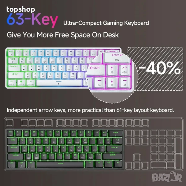 【Опростен дизайн】 T63 е компактна механична клавиатура с 63 клавиша, като всички функции се изпълняват чрез комбинирания клавиш "FN", за да се поддържат всички функции, като същевременно се освобождава повече място на бюрото.