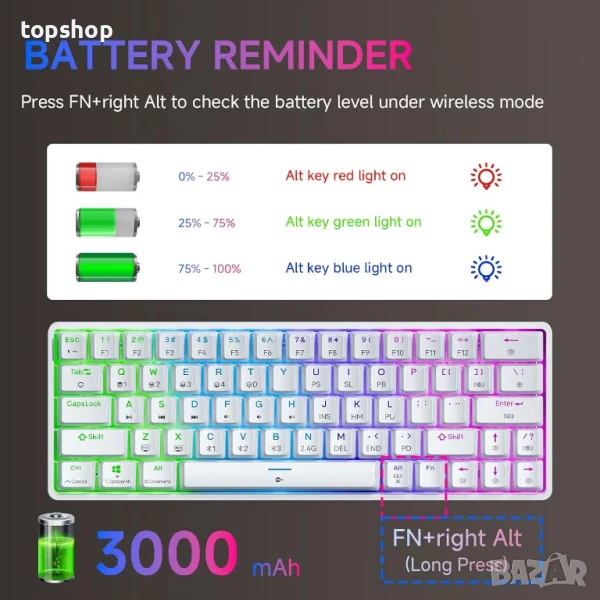 Клавиатурата е снабдена с вътрешна батерия с капацитет 3000 mAh, което гарантира дълъг експлоатационен живот. Това означава, че можете да работите или играете дълго време, без да се налага да зареждате често, когато използвате безжичен режим.