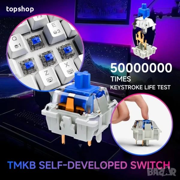 TMKB T63 механична клавиатура с Blue Switch, Bluetooth / 2.4GМеханична клавиатура, бяла