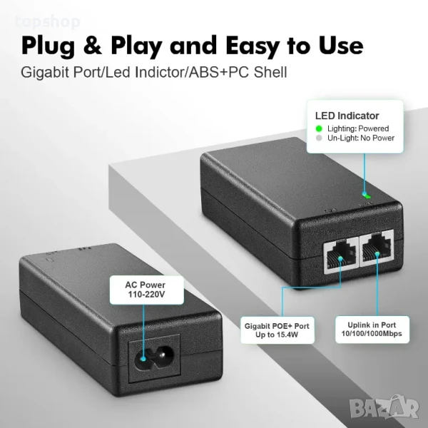 【2 Gigabit Ports】 Този PoE инжектор включва 1 Gigabit Ethernet входен порт и 1 Gigabit Ethernet изходен порт с PoE захранване. Макс. 1000Mbps с отлична производителност на данни. 48V/15W PoE инжекторът може да конвертира не-PoE устройства в PoE; Можете лесно да активирате PoE, без да се налага да заменяте съществуващия си превключвател/устройство без PoE.