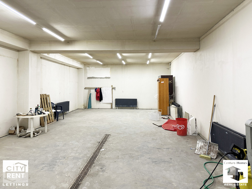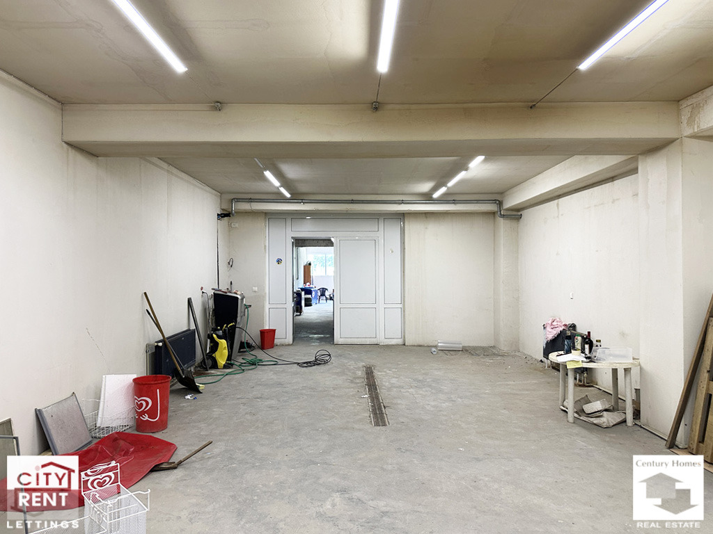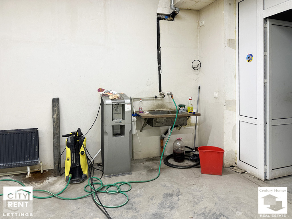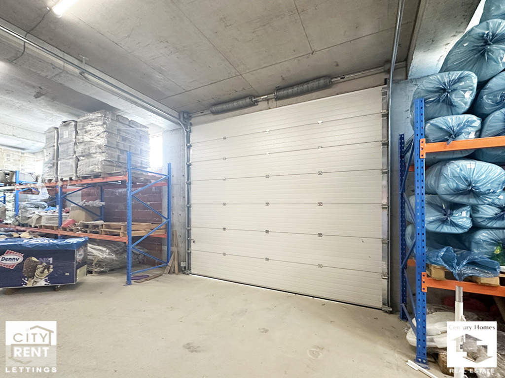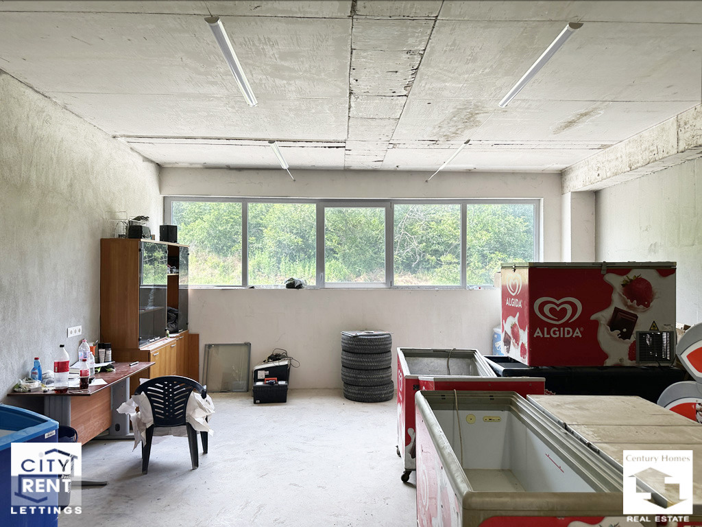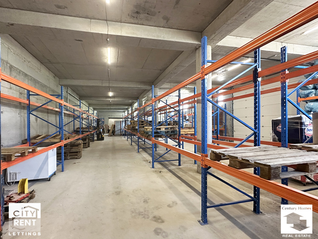 термопанели, което осигурява добра топлоизолация, и разполага с PVC дограма, стабилна бетонна подова настилка, електрозахранване, водоснабдяване и канализация. Пространството е функционално организирано основното помещение е широко и светло, оборудвано със стелажи и две секционни врати, улесняващи товаро-разтоварни дейности и придвижване на палети. От него се преминава към две преходни помещения, като в едното има мивка и отопление с парно, което го прави подходящо за обособяване на офис, стая за персонала или работна зона.