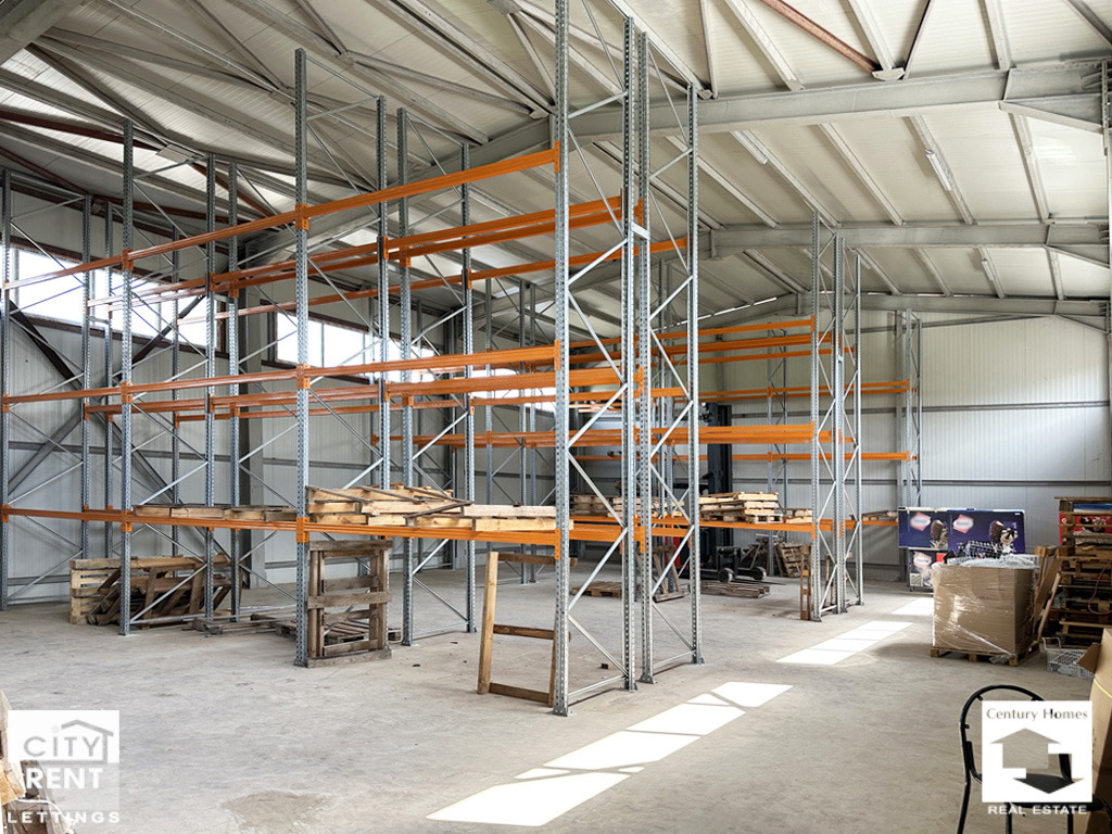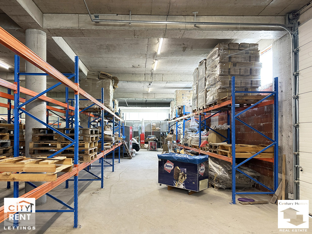 Първото ниво (600 кв.м.) включва просторно основно помещение, оборудвано със стелажи и две секционни врати, позволяващи лесен достъп за палетизирана стока и удобна товаро-разтоварна дейност. От него се преминава към две преходни помещения, едното от които е снабдено с мивка и отопление с парно, подходящо за офис, работна зона или помещение за персонала.